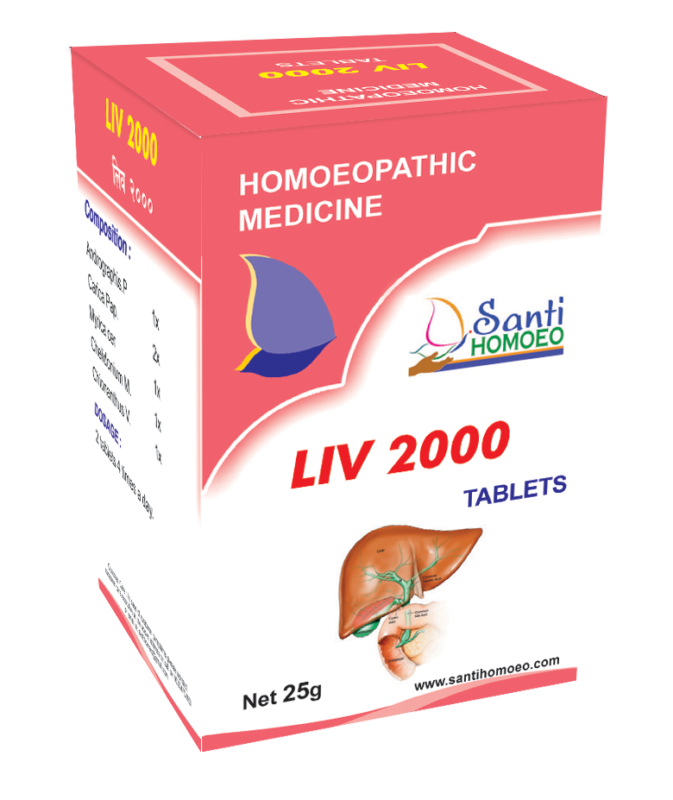 LIV 2000 Tablets by Shanti Homoeo are formulated to support liver health and improve digestive function. It is useful in conditions like hepatitis, jaundice, liver enlargement, and common digestive complaints such as gas, indigestion, dyspepsia, and loss of appetite.