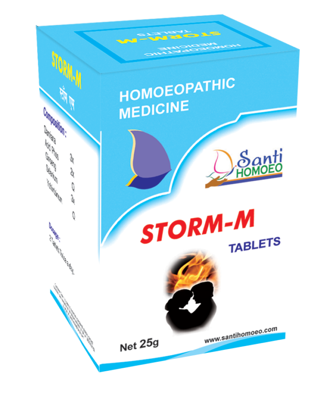 STORM-M Tablets by Shanti Homoeo are specially formulated to support men facing concerns like impotency, weakness of genital organs, low sexual desire, and reduced vitality. This medicine helps stimulate sexual organs and supports improved energy, confidence, desire, and erection strength.